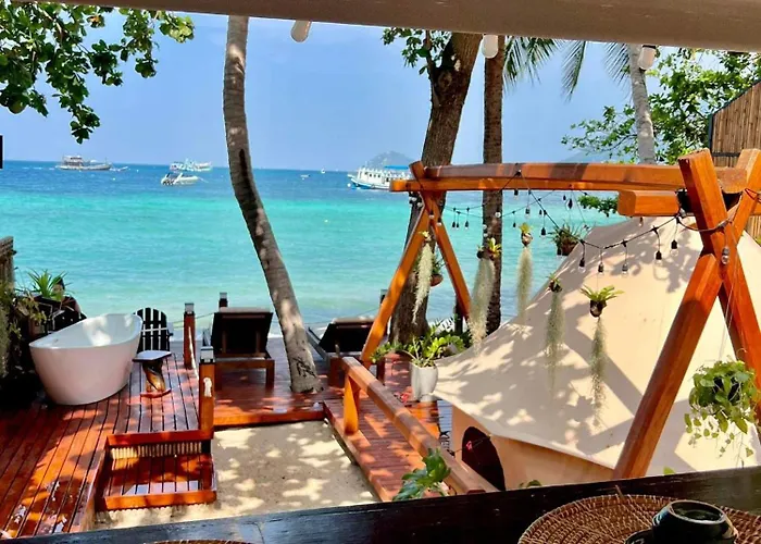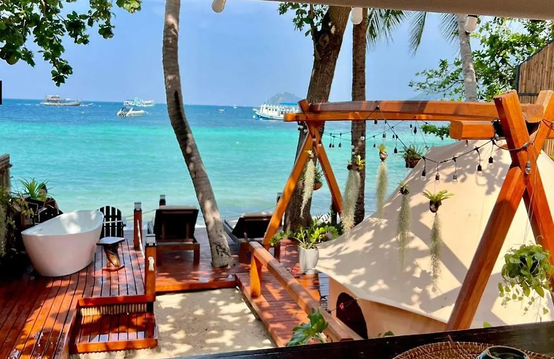 Zur Entspannung der Gäste bietet die 1-Zimmer- Hotel Natures Edge Beachfront Luxury Glamping Koh Tao eine Terrasse, ausgestattet mit Möbeln.